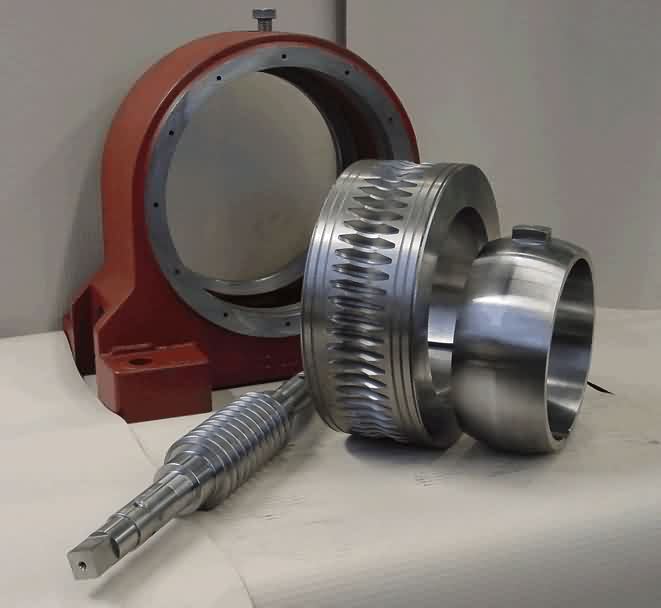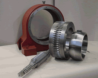 Edelstahlzapfen. Gelagert ist die Schneckenwelle in Pendelrollenlager